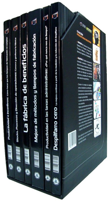 Los libros que contienen la colección para la parte puramente industrial son: 1. Despilfarro cero: La mejor continua partir de la medición y reducción del despilfarro. 2. Mejorar de métodos y tiempos de fabricación. 3. Productividad e incentivos: Cómo hacer que los tiempos de fabricación se cumplan. 4. Stocks, procesos y dirección de operaciones: Conoce y gestiona tu fábrica. Se finaliza la colección con dos libros complementarios, necesarios para la mejora del desempeño del lector de tal manera que pueda adquirir habilidades para la supervisión de la producción y para la puesta en marcha de las distintas y mejoras. 5. Productividad en tareas administrativas: ¿Por qué nunca nos da tiempo? 6. La fábrica de beneficios: Una guía para la productividad gerencial. El objetivo es proveer los contenidos necesarios e imprescindibles en los que se describan las herramientas necesarios para hacer de todo proceso de fabricación una actividad productividad y competitiva. Por medio de esta colección se aprenderá: -Conocer el concepto de despilfarro para su localización y su eliminación. -Dimensionar los recursos de la fábrica (mano de obra y número de máquinas). -Analizar la productividad. -Localizar cuellos de botella y desequilibrios existentes. -Mejorar aprovisionamiento de materiales. -Controlar el curso de la producción. -Conocer los tiempos de fabricación y de preparación de máquinas y reducirlos. -Mejora los procesos de fabricación. -Ser un mejor directivo a partir de la adquisición de un criterio de dirección. -Organizar mejor las tareas de oficina. Esta colección provee de todas las herramientas para ser un experto en productividad industrial