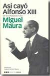 Cuando se publicó por primera vez Así Cayó Alfonso XIII (1962), Miguel Maura quería contribuir a la liquidación del franquismo recordando la transición ejemplar que había llevado del Pacto de San Sebastián a las Constituyentes de la República, en julio 1931. Con la presente reedición de este texto, ya clásico, publicamos la continuación de las memorias que dejó escritas, junto a discursos, cartas y artículos coetáneos suyos que abarcan desde los últimos meses de su ejercicio de Ministro de la Gobernación hasta el 18 de julio de 1936. Situado en el ojo del huracán, Miguel Maura no dejó en momento alguno de percibir y avisar de lo que importaba, donde más útil podía resultar abogar por las soluciones aún posibles. Si el autor de estas páginas fue en cierto sentido el emblema de lo que la República pudo ser, también su biografía nos ayuda a comprender el peso de la experiencia de la monarquía constitucional en los hombres del 31.
