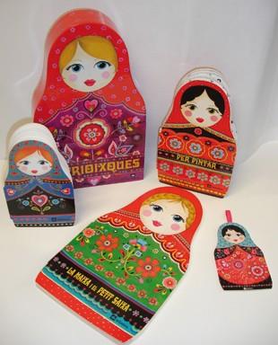 Una caixa Matrioixca amb un munt de sorpreses a dins: un conte, un bloc per pintar, un bloc de notes i una nina per jugar.