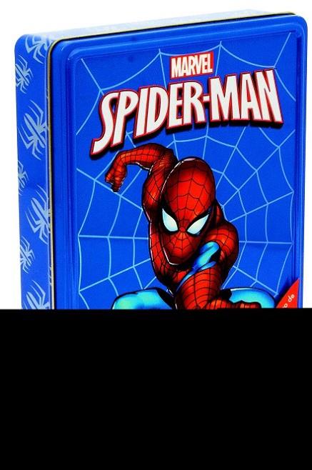 Esta caja metálica contiene un libro de cuentos de 32 páginas, un libro de colorear de 24 páginas y un libro de actividades de 24 páginas. Incluye también 4 rotuladores de colores, un póster doble y una hoja de adhesivos. ¡Pásalo en grande junto al hombre araña! ¡Acción, heroísmo y diversión!