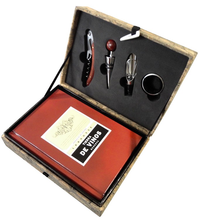La caja contiene, además del libro, unos utensilios que harán las delicias de los amantes del vino: sacacorchos, anillo recoge-gotas, un tapón y un dosificador antigoteo. Todo ello, presentado en un estuche perfecto para un regalo original.