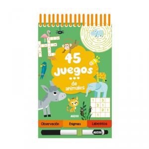 45 juegos es una nueva colección de libro-juegos en un práctico formato pequeño con un rotulador borrable ¡para divertirse por todas partes y todo el tiempo! 45 juegos alrededor de un momento o situación (de vacaciones, de viaje, mientras esperas…) divididos en 3 secciones: 15 juegos de observación (busca y encuentra, juegos de sombras, juegos de las 7 diferencias, intruso, juego de parejas…), 15 enigmas (sudoku, crucigramas, sopas de letras, juegos de deducción, unir puntos, juegos gráficos, juegos de cálculo) y 15 laberintos. Con 5 páginas de soluciones al final.
