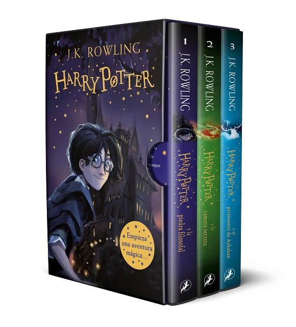 Empieza una aventura mágica con los tres primeros volúmenes de la ya clásica serie de Harry Potter. Este estuche contiene las novelas: Harry Potter y la piedra filosofal Harry Potter nunca ha oído hablar de Hogwarts hasta que empiezan a caer cartas en el felpudo del número 4 de Privet Drive. Llevan la dirección escrita con tinta verde en un sobre de pergamino amarillento con un sello de lacre púrpura, y sus horripilantes tíos se apresuran a confiscarlas. Más tarde, el día que Harry cumple once años, Rubeus Hagrid, un hombre gigantesco cuyos ojos brillan como escarabajos negros, irrumpe con una noticia extraordinaria: Harry Potter es un mago, y le han concedido una plaza en el Colegio Hogwarts de Magia y Hechicería. ¡Está a punto de comenzar una aventura increíble! _________________ Harry Potter y la cámara secreta El verano de Harry Potter ha incluido el peor cumpleaños de su vida, las funestas advertencias de un elfo doméstico llamado Dobby y el rescate de casa de los Dursley protagonizado por su amigo Ron Weasley al volante de un coche mágico volador. De vuelta en el Colegio Hogwarts de Magia y Hechicería, donde va a empezar su segundo curso, Harry oye unos extraños susurros que resuenan por los pasillos vacíos. Y entonces empiezan los ataques y varios alumnos aparecen petrificados... Por lo visto, las siniestras predicciones de Dobby se están cumpliendo... _________________ Harry Potter y el prisionero de Azkaban Cuando el autobús noctámbulo irrumpe en una calle oscura y frena con fuertes chirridos delante de Harry, comienza para él un nuevo curso en Hogwarts, lleno de acontecimientos extraordinarios. Sirius Black, asesino y seguidor de lord Voldemort, se ha fugado, y dicen que va en busca de Harry. En su primera clase de Adivinación, la profesora Trelawney ve un augurio de muerte en las hojas de té de la taza de Harry... Pero quizá lo más aterrador sean los dementores que patrullan por los jardines del colegio, capaces de sorberte el alma con su beso...