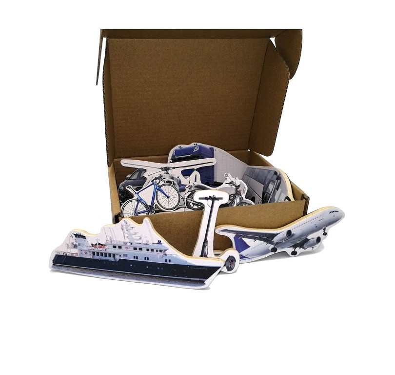 Diez imanes en madera de bambú con imágenes reales de medios de transporte impresas directamente sobre la superficie de bambú.Para colocar sobre cualquier superficie metálica.Incluye: avión, moto, barco, helicóptero, autobús, tren, bicicleta, coche, camión y patinete.