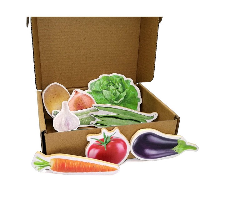 Diez imanes en madera de bambú con imágenes reales de hortalizas impresas directamente sobre la superficie de bambú. Para colocar sobre cualquier superficie metálica. Incluye: cebolla, patata, pepino, tomate, calabacín, ajo, berenjena, zanahoria, lechuga y judías.