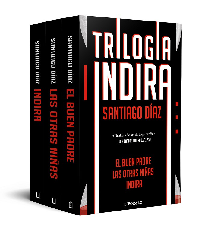 Edición estuche con los tres volúmenes de la «Trilogía Indira» de Santiago Díaz. «Santiago Díaz se atreve con lo que nunca antes nadie se había atrevido. Brillante». Carmen Mola «Me ha tenido pegado a sus páginas todo el fin de semana. No dejéis de leerlo.» Juan Gómez-Jurado«Torturando el pasado, Santiago Díaz consigue desgarrarte por dentro y que no seas capaz de dejar de leer.» César Pérez Gellida El buen padre Después de recibir una llamada de alarma, la policía encuentra en un chalé de una urbanización madrileña a un hombre manchado de sangre y un cuchillo con sus huellas junto al cadáver de su mujer.Un año más tarde, un anciano se entrega a la policía afirmando ser el secuestrador de tres personas desaparecidas: el abogado defensor de su hijo, la jueza que le condenó y una joven estudiante que testificó en su contra en el juicio. Convencido de que los tres fueron sobornados, el hombre asegura que morirán uno cada semana hasta que detengan al verdadero asesino de su nuera y su hijo sea liberado. La inspectora Indira Ramos, de una ética tan inquebrantable como sufobia a los microbios, solo tiene tres semanas para resolver el caso antes de que «el buen padre» lleve a cabo su macabro plan. _________________ IndiraPara la inspectora Indira Ramos ha sido un año repleto de sucesos: cazó a un monstruo al que todo el mundo daba por muerto, perdió a uno de sus mejores agentes en un desgraciado accidente y tuvo que elegir entre los dos hombres de su vida. Pero, cuando todo parecía haber vuelto a la normalidad y se presentaba ante ella una etapa tranquila, la vida se empeña en ponerle las cosas más difíciles que nunca y tendrá que enfrentarse, junto al inspector Iván Moreno, a un caso que les unirá o les separará para siempre.Su equipo tiene que investigar el hallazgo de varios cadáveres en un solar en construcción. Nada parece unir a las víctimas y solo investigando su pasado podrán entender por qué les han ido matando uno a uno. _________________Las otras niñas La inspectora Indira Ramos apura sus últimos días de excedencia en un pequeño municipio de Extremadura. Cuando, después de casi tres años, llega el momento de abandonar su retiro y regresar a su trabajo en Madrid, se ve incapaz de enfrentarse al subinspector Iván Moreno, al que oculta un enorme secreto.Pero ambos tendrán que volver a trabajar mano a mano para resolver el mayor rompecabezas criminal de la historia contemporánea de España: en una gasolinera han aparecido las huellas dactilares del que fue durante muchos años el hombre más buscado del país. El brutal asesinato que cometió ha prescrito y la policía ya no tiene razones para mantener detenido al principal sospechoso, que lleva tiempo viviendo bajo una identidad falsa. Pero la inspectora Ramos está convencida de que un asesino como él ha tenido que volver a matar, así que solo necesita encontrar un crimen del que no quede impune. _________________